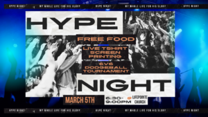 Friends don’t let friends miss Hype Night!! Be sure to join us for an incredible event: Free Food, Live T-Shirt Screen Printing, and a Dodgeball tournament!! Followed by powerful worship and a message from Pastor Nick!